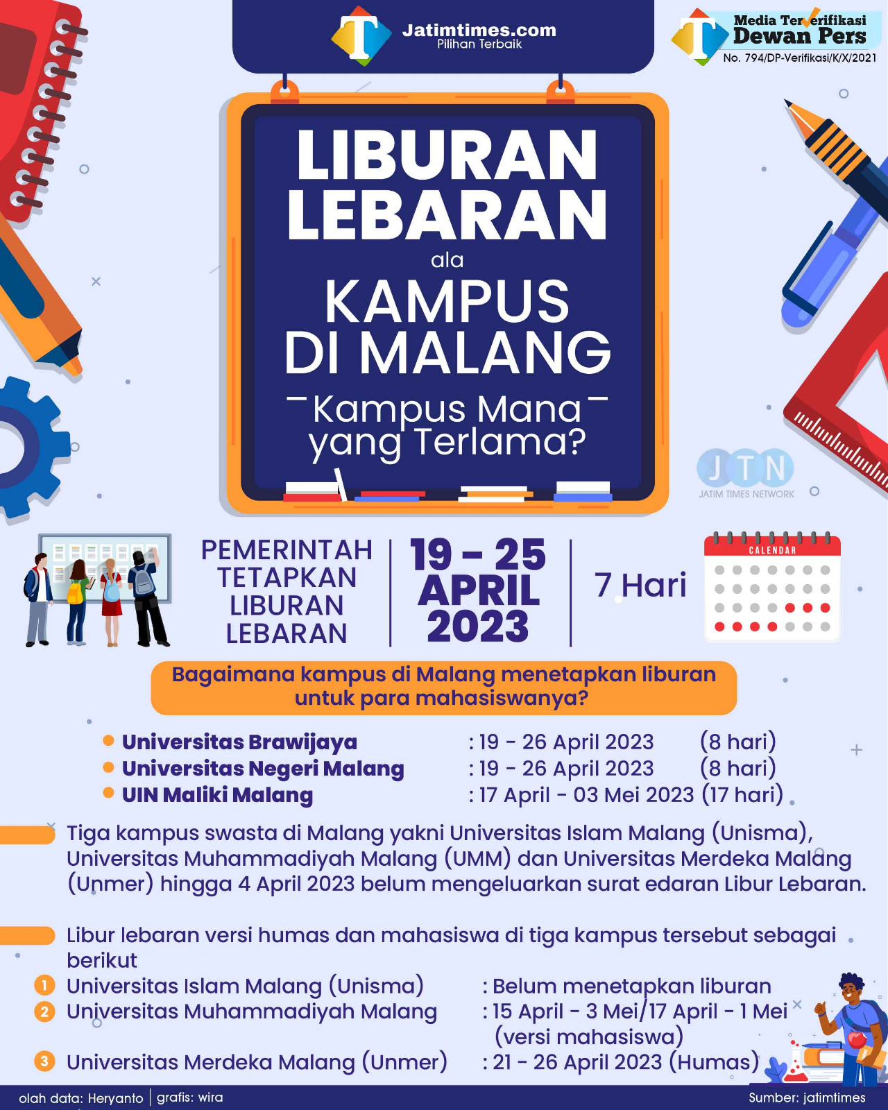 UMM misalnya beredar informasi di kalangan mahasiswa dan dosen akan libur pada 15 April - 3 Mei. Ada juga yang menyebutkan bahwa UMM akan meliburkan mahasiswanya saat lebaran mulai 17 April - 1 Mei 2023.