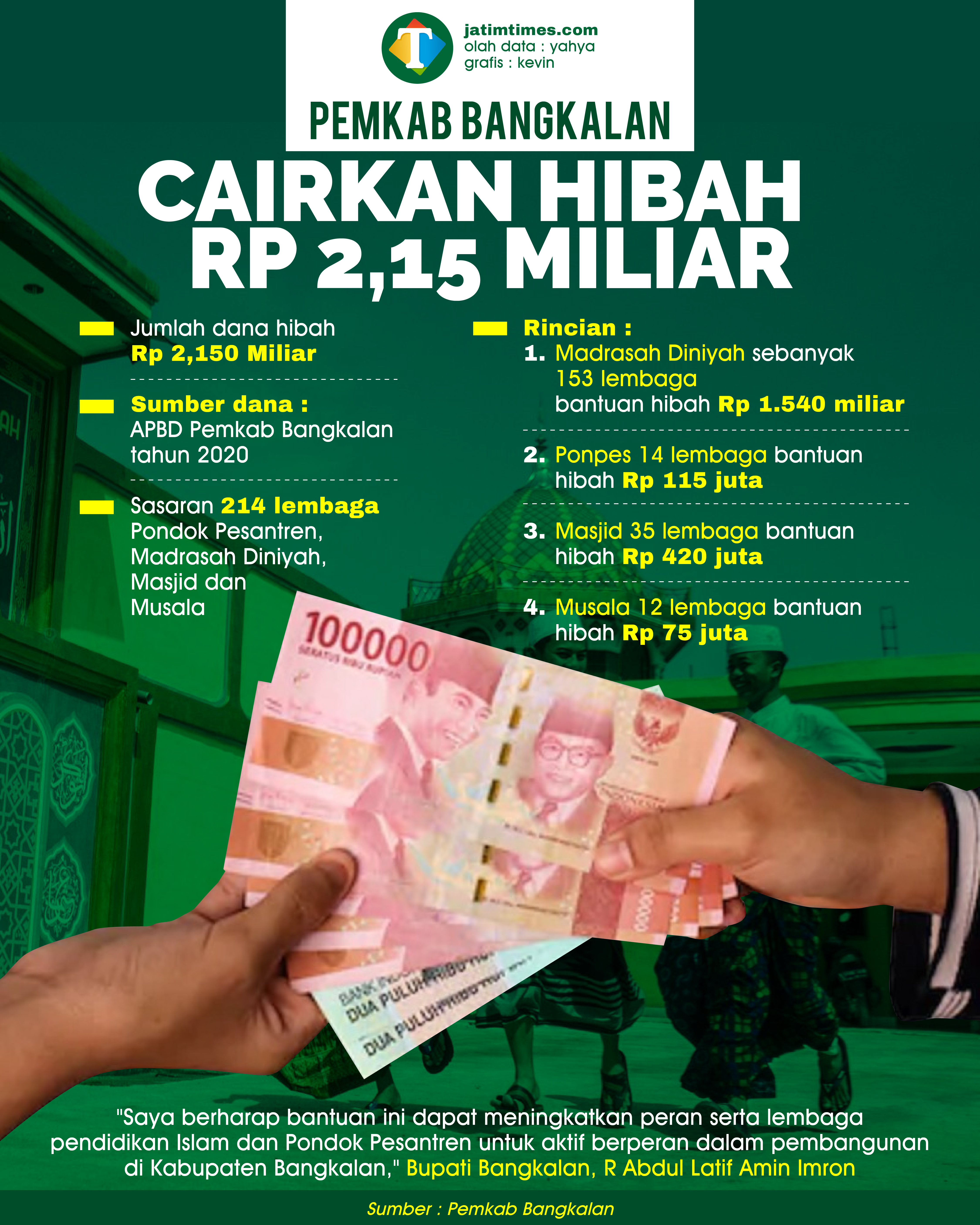 BANGKALANTIMES - Pemerintah Kabupaten Bangkalan, Madura, Jawa Timur salurkan bantuan dana hibah sebesar Rp 2,150 miliar kepada 214 lembaga. Bantuan yang  dikucurkan bersumber dari Anggaran Pendapatan Belanja Daerah (APBD) tahun 2020.